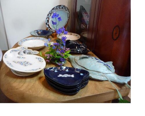 *海の魚をイメージした作品、個性的な作風で知られる 佐々木浩章さんの作品。 昨年はフランスで個展もされたという佐々木さん、 今回は特に「青」を意識した作品が並んでいます。 器の展示の中に花あしらいを加えてみました。 命が加わり、今にも魚が動き出…