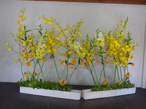 今回は未来に希望を託して、黄色のグラデーションの 作品でまとめました。 植田早苗 作 一人娘の結婚を祝って!! 鈴木れい子 作 大切な青磁の花器に、家族の健康を願って!! 成田怜子 作 庭の落ち葉をいつくしんで、リースに!! 飯嶋 泉 作 テーブルの花 …