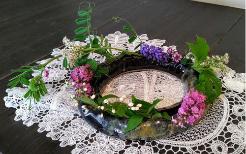 庭の小さな花たちでテーブルの上のリースを作ってみました。 リースは永遠、繋がりなどを表現しています。 古い友人の作った円環の器、とても使いやすく楽しめます。 花材 : 姫空木、アシュガ、ムスカリ、カラスノエンドウ、タンチョウソウ、 <西洋の植物…