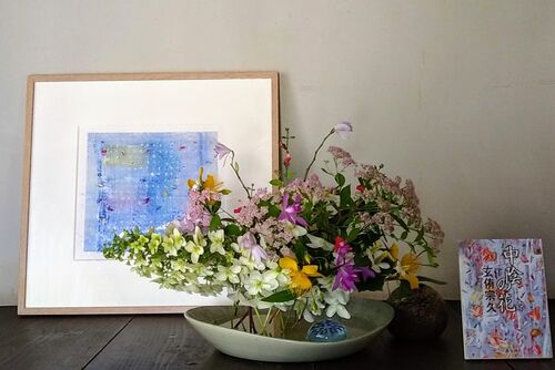◎花とアートとライブラリー@ギャラリー明日荷 6年前の<犬も歩けば・・・展>を思い出して、同じお仲間の別の作品からイメージして庭の花を活けてみました。 現代アート作家伊藤彰規さん(北見市)、作家で僧侶の玄侑宗久さん(三春町)、陶芸家の矢萩典行…