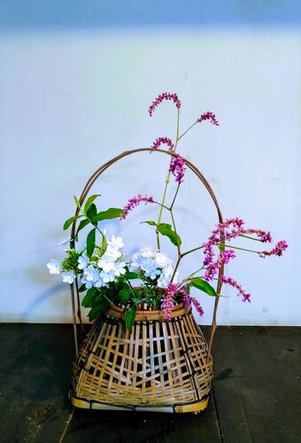 ◎花あしらい 赤紫色の花が美しいオオケタデと白のフロックスをあわせて、宗全籠に活けました。オオケタデは別名オオベニタデ(大紅蓼)とも言われ蓼科ですが、イヌタデよりもとても大きな植物です。 #花あしらい #生け花 #茶花 #籠の花 #宗全籠#久田宗全好み #…