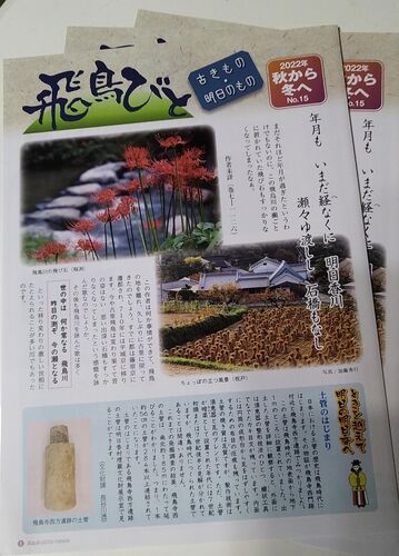 先日、古都飛鳥保存財団より「飛鳥びと」の冊子が送られてきました。 裏面は明日香村観光マップ。 このところ、飛鳥をテーマにした、新聞記事やTV番組など、沢山、目にしますね。 これは高松塚古墳壁画発見50年に寄せて、飛鳥藤原京の世界遺産への登録の 準…