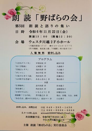 元坂戸グランドホテルのカルチャ―で開催されていた 朗読の会が北坂戸オルモに会場を移し、引き続き勉強会が行われています。 11月22日(金)にウエスタ川越で発表会があります。 申し込みは ギャラリー明日荷 植田でも受け付けております。 e-mail sanaeueda…