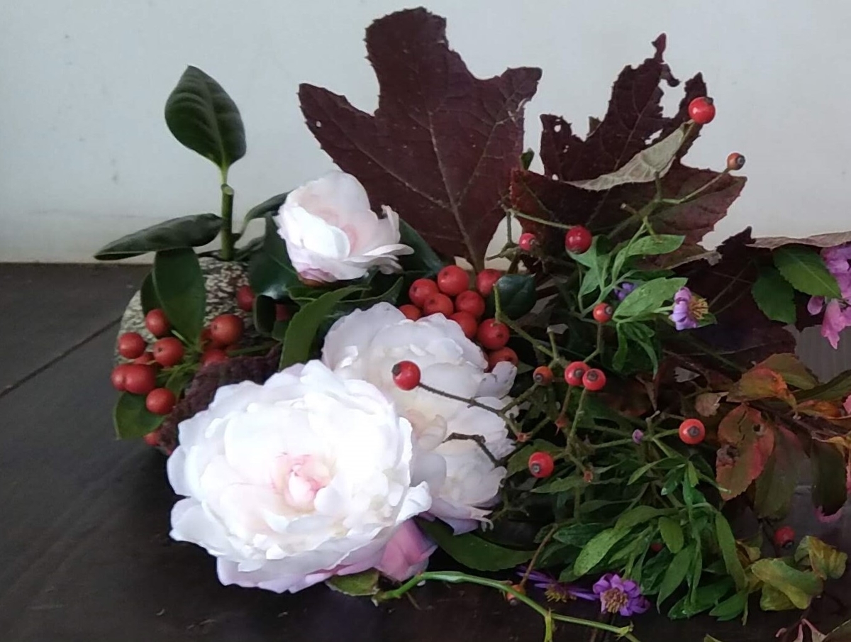 紅葉している雪柳、柏葉紫陽花、ローズヒップ、 ホーリーホック、