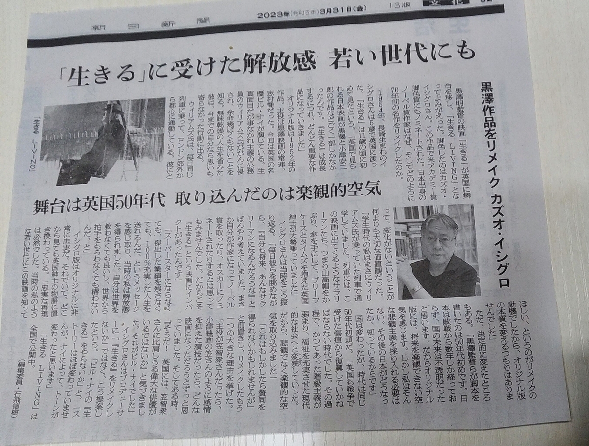 一昨日若葉ウオークでカズオ・イシグロ脚色の「生きる LIVING」を観てきました。